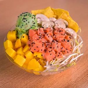 Arroz sushi, salmon, palta, mango frejol chino, champiñones, spicy hot, mix ajonjoli, nachos.